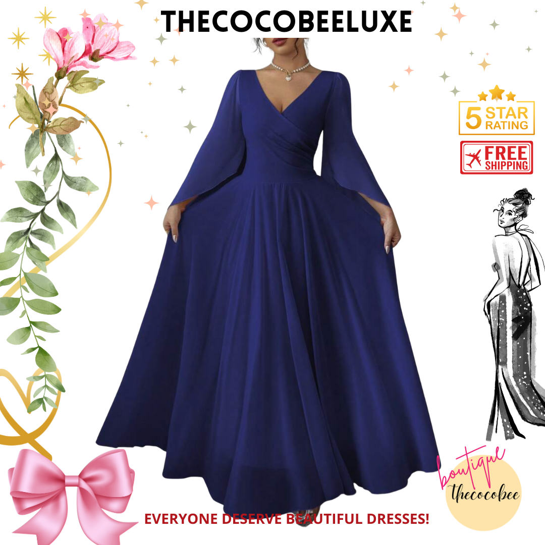#015 Elegant Romantic Wedding, Bridesmaid, Prom, event Long Sleeve Dress - Navy Blue
