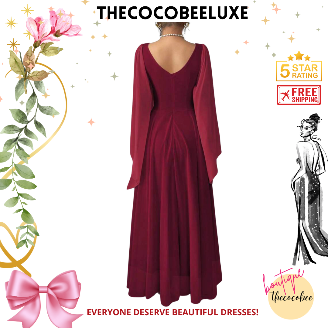 #015 Elegant Romantic Wedding, Bridesmaid, Prom, event Long Sleeve Dress - Burgundy