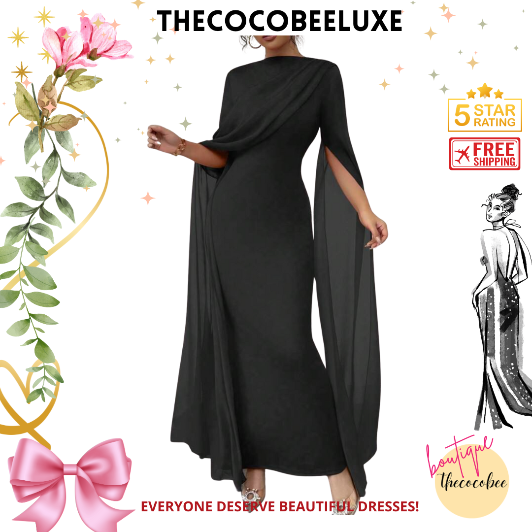 This elegant black slim-fit dress features a chic stand collar, dramatic cloak sleeves, and a flattering high-waist flared hem. Designed with contrast mesh, soft draping, and a back zipper for a refined, modern look. Made from medium-stretch knitted fabric (95% polyester, 5% elastane), unlined and non-sheer for comfortable wear.