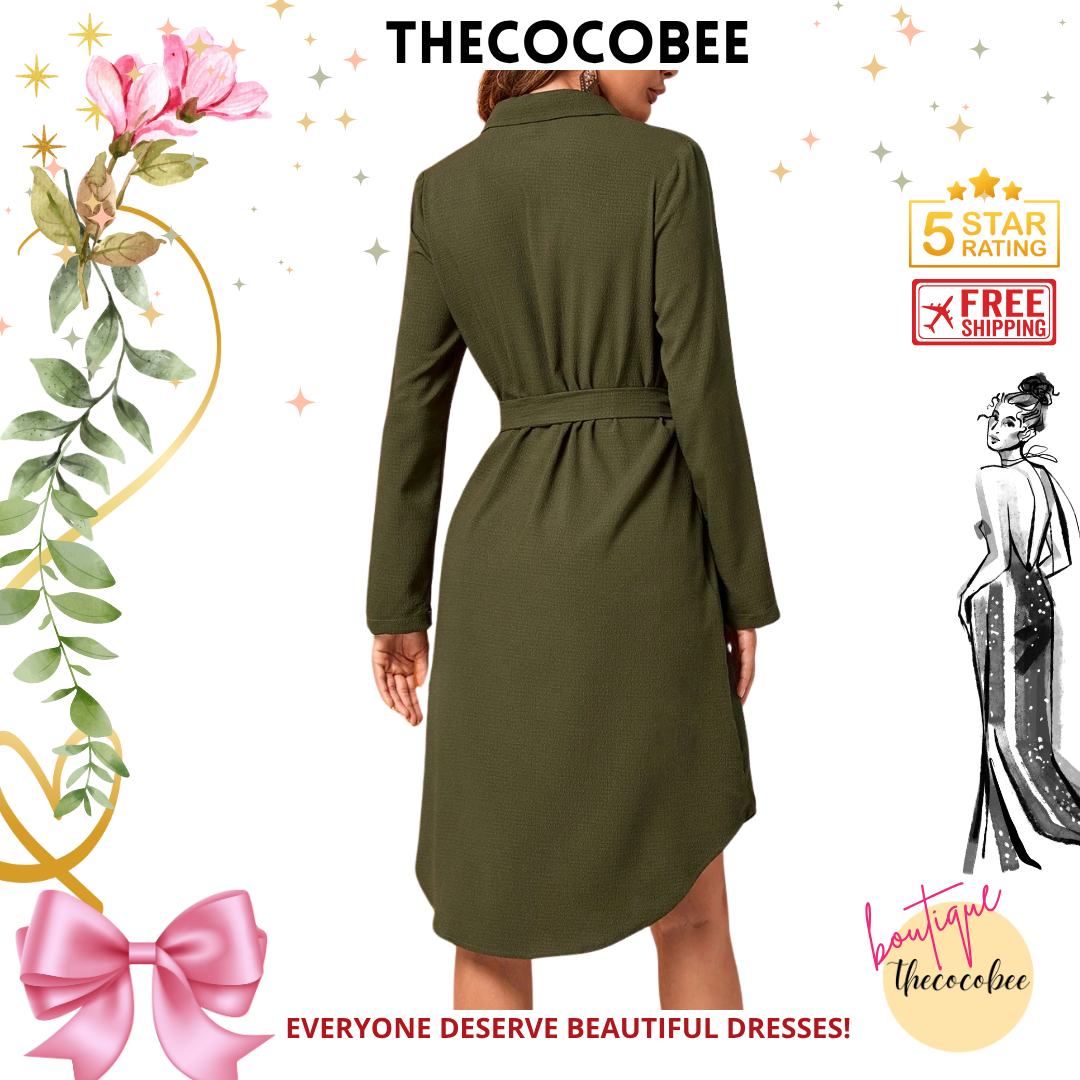 #162 Army Green Long Sleeve Midi Dress Fall Women Dresses Work Women Dresses