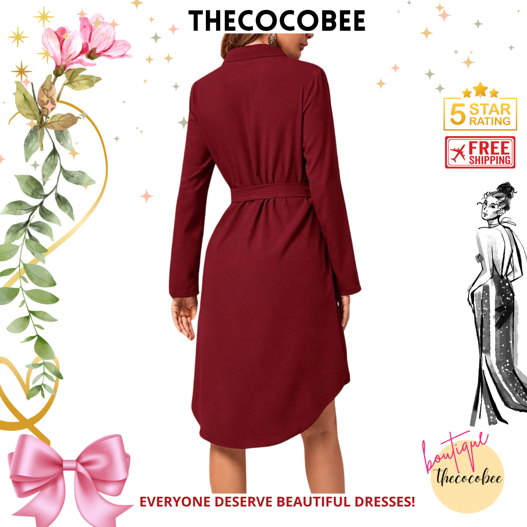 #162 Burgundy Long Sleeve Midi Dress Fall Women Dresses Work Women Dresses